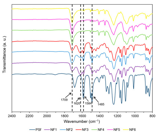 In order to confirm the incorporation of nanomaterials in the PA layer, the FTIR spectra of the prepared membranes were obtained (Figure 3). As a reference, the spectrum of the PSf support was taken. It is clear that most of the signals in the spectra of NF membranes come from the PSf support. The peaks at 1584 cm−1, 1485 cm−1, 1220 cm−1, and 1120 cm−1 correspond to the PSf substrate [55]. The intensity of these signals is lower for the NF membranes since, in these membranes, a PA film covers the PSf. Main differences between NF membranes and PSf are the signals at 1709 cm−1 and 1620 cm−1. The characteristic peak of the amide I (C=O) stretch at 1620 cm−1 appears stronger in membranes NF1, NF2, and NF3 than in membranes NF4, NF5, and NF6 [56]. In addition, the membranes prepared incorporating GO in the organic phase show a stronger carboxylic acid C=O signal at 1709 cm−1, indicating the presence of a higher amount of hydrolyzed acyl chloride groups due to solid disaggregation. These results may also be attributed to additional COOH and COCl groups in the GO and Cl-GO, respectively, added during the preparation of membranes with incorporated GO-based material in the organic phase. NF3 shows a weaker carboxylic C=O peak (1709 cm−1) than the membrane NF2, which could be related to the less carboxylic groups in N-GO. A stronger amide C=O peak (1620 cm−1) can be observed in NF3 compared to NF2, indicating the presence of amine groups in N-GO. Both NF1 (blank) and NF3 showed similar behavior for C=O (1620 cm−1) peak intensity, indicating that the addition of N-GO may have enhanced crosslinking, either by preventing disaggregation of the solid or by forming covalent interactions with PA chains.