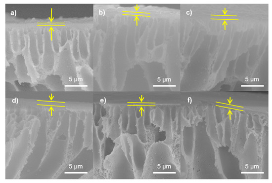 Cross-sectional images obtained by SEM for prepared NF membranes: (a) NF1, (b) NF2, (c) NF3, (d) NF4, (e) NF5, and (f) NF6.