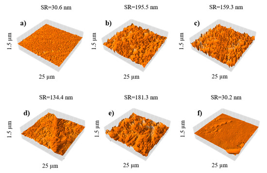 Surface topography of NF membranes: (a) NF1, (b) NF2, (c) NF3, (d) NF4, (e) NF5, and (f) NF6.