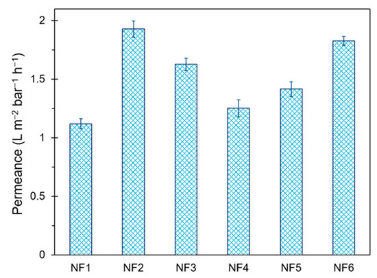 All performance tests were carried out in the same chronological order to ensure reliable results. Pure water flux results are shown in Figure 7. Permeance increased from 1.120 to 1.929 L m−2 bar−1 h−1 due to the addition of GO during IP. It is likely that GO disrupted the polymer chains, increasing both pore size and hydrophilicity of the membrane surface. A similar behavior was observed for N-GO. Although N-GO presented less functional groups than GO, a slight increase in permeance for NF3 was observed, compared to NF1. This effect may suggest that fewer groups in N-GO confer high hydrophilicity. Membranes prepared with GO-based materials in the organic phase showed significantly less permeance (up to 35% lower compared to NF2); this may be related to the SEM and AFM results, which suggest the presence of a thicker selective layer in NF4 and NF5. On the other hand, NF6 reached almost the same permeance value as NF2, while it exhibited a lower surface roughness than the blank membrane.