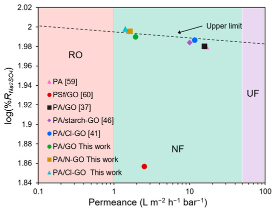 A simple method for preparing N- and Cl-functionalized GO was accomplished with a high degree of functionalization (~15% and ~16% for N and Cl, respectively). The dispersability of GO in the organic phase was significantly improved due to the incorporation of COCl groups. The developed ex situ IP reaction proved that it is possible for N-GO and Cl-GO to form amide bonds as expected for PIP and TMC, as confirmed by FTIR. The NF membranes prepared adding GO-based materials in the aqueous phase showed remarkable performance for Na2SO4 separation, with very similar permeance in comparison to other reported NF, which is evidenced in Figure 10 [37,41,46,59,60]; thereby, further applications for water desalination are feasible. On the other hand, prepared Cl-GO/PA membranes presented significantly less permeance but a higher salt rejection capacity. Cl-GO-added membranes showed an increase in saccharide rejection capacity, making other potential applications such as dye or volatile organic compound removal possible. The enhanced dispersability of functionalized GO materials allows for a more uniform distribution of GO in the PA layer, modifying membrane properties. The incorporation of chemically modified GO in the structure of NF membranes appears to be a suitable strategy for improving its permeance.