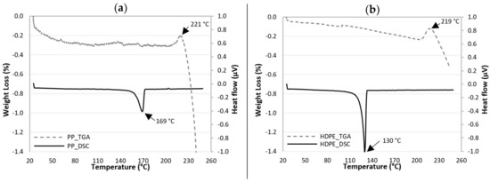 Figure 1a,b show the DSC and TGA curves as a function of temperature, for PP and HDPE, respectively. The DSC curve of PP show an endothermic melting peak at 169 °C. The TGA curve shows that the onset of PP degradation occurs at around 221 °C, while the DSC curve for HDPE exhibits an endothermic melting peak at 130 °C and the TGA curve show that the degradation begins at around 219 °C.