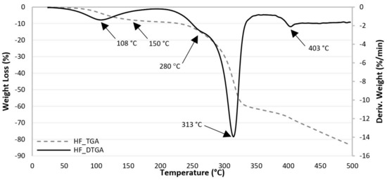 The TGA curve of HF shows that thermal degradation starts at around 150–200 °C and becomes rapid at 280 °C. The thermal degradation of HF is a four-stage process. The DTGA curve show an initial peak at 108 °C (weight loss of 5%), which is due to the loss of water and is the first stage. According to Wielage et al. [43] hemicellulose is generally thought to decompose first, followed by cellulose and lignin. Therefore, the second degradation stage observed between 230–290 °C (weight loss 13%), with the maximum decomposition rate at 280 °C is associated with the degradation of hemicellulose. The third degradation stage, which is attributed to the degradation of cellulose, occurs at temperatures between 290–337 °C (weight loss of 36%), with the maximum decomposition rate at 313 °C. Lignin is the most difficult component to decompose and its decomposition occurred slowly, with a maximum decomposition rate at 403 °C (weight loss 67%) [13,37,44].