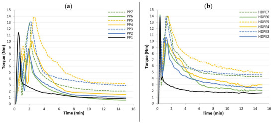 Torque versus time curves for (a) composite formulations based on a PP matrix and for (b) composite formulations based on a HDPE matrix.