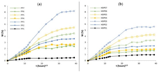 Water absorption curves of (a) PP and composites based on a PP matrix and (b) HDPE and composites based on a HDPE matrix.