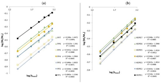 where is the water content at time , is the water content at the equilibrium, is a constant characteristic of the specimen, which provides an idea about the interaction of water with the material, while can change depending on the mode of diffusion [12]. Depending on coefficient the diffusion process can be classified as: Case I, or Fickian diffusion and pseudo-Fickian , while for Case II and super Case II . For non-Fickian or anomalous diffusion, Case III [46]. The coefficients and were determined by linear regression analysis based on experimental data (Equation (3)), according with Figure 5a,b and are summarized in Table 9.