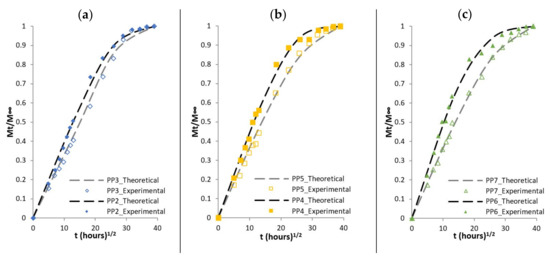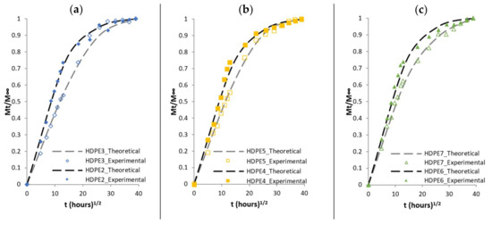 The following comparison aims to check whether the theoretical model and the parameters determined above, can reproduce the response of the experimental diffusion results. Experimental and theoretical curves are compared for composites based on PP matrix as well as for composites based on HDPE matrix in Figure 6 and Figure 7, respectively. The dashed lines represent theoretical results while the dots represent the results from the experimental results. The theoretical results capture the initial slope (linear initial stage) up to , however beyond the initial stage, the concave curves to the abscissa, does not exactly fit the experimental results, in particularly for composites materials such as PP4, PP5 and PP6 or HDPE3, HDPE4 and HDPE6.