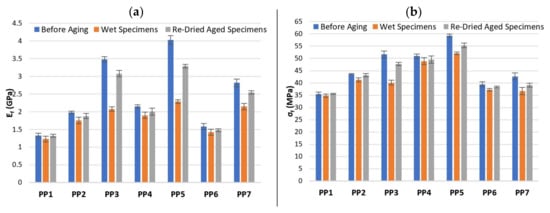 In the flexural tests, the load is transferred through the matrix-fiber interface and consequently the interfacial adhesion between matrix and hemp fiber largely determines the flexural mechanical properties of the composites. For specimens before aging, Figure 8 and Figure 9 shows that the flexural mechanical properties of composites based on HDPE matrix are lower than composites based on PP, moreover, the increases with both, fiber content and addition of CA. Although, composites with CA + SA (PP6, PP7 and HDPE6, HDPE7) show two distinct flexural behaviour: (1) HDPE6 and HDPE7 composites exhibited slightly higher values of , whereas (2) PP6 and PP7 composites, both the values of decreased considerably with respect to CA composites (PP4 and PP5) by about 26.8% (PP4 to PP6), 30.3% (PP5 to PP7) for and by about 22.6% (PP4 to PP6), 28.1% (PP5 to PP7) for . The addition of SA compromised the flexural mechanical properties of PP6 and PP7 composites. Similar mechanical behaviour is found on studies on cork particles reinforced PP composites in which MAPP and SA are used as coupling agents, by Fernandes et al. [22]. The results show that the tensile strength and tensile modulus decreases with the addition of SA by about 21.7% and 3.9% with respect to composites with MAPP. Dányádi et al. [52] observed in their experiments on PP composites reinforced with 20% wood flour, that the addition of SA led to a moderate reduction of tensile strength. Also, similar conclusions are found in the study performed by Stark [53] in which the tensile and flexural mechanical properties were slight reduced upon SA addition to a 40% wood-reinforced PP composite. According to Dalvag et al. [54] the decrease in tensile strength might be due to the plasticizing effect on the PP matrix resulting from the addition of SA, which can give rise to poorly bonded regions between matrix-fiber, leading to ineffective stress transfer. Nevertheless, some research studies [22,52,53] have reported a reduction of water absorption, improvements on homogeneity (better dispersion of the fiber throughout the matrix) and processability of composites with the addition of SA. Enhanced (Table 11 and Table 12) of 4.03 and 2.46 GPa, and of 59.31 and 41.64 MPa were obtained for PP5 (CA) and HDPE7 (CA + SA) composites composed of 40 wt% hemp fiber, respectively. The percentage increase of and of PP5 over PP1 and HDPE7 over HDPE1 are 205.3%, 67.4% and 152.5%, 102.5%, respectively. The improved flexural properties of PP5 and HDPE7 might be due to an increase in the interface adhesion between matrix-fiber, which allows a better and effective load transfer throughout the interface [48]. PP2, PP3, HDPE2 and HDPE3 composites exhibited low flexural mechanical properties, which might be due to the poor interaction between the hydrophilic HF and the hydrophobic matrices.