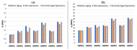 Effect of water absorption on (a) and (b) for HDPE and composites based on a HDPE matrix.