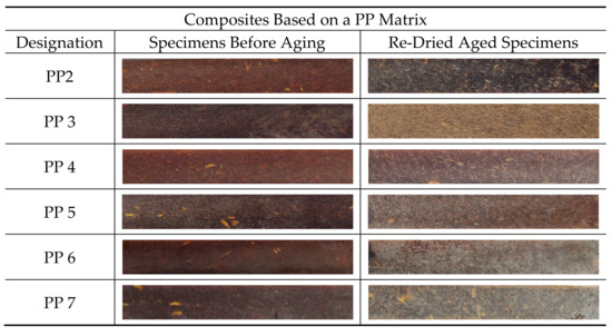 Also, the influence of water absorption on the colour change on the surface of re-dried aged specimens was analysed visually. The discoloration of thermoplastic composites reinforced with natural fibers is a disadvantage for outdoor applications, because the changes in appearance can have a negative impact on the aesthetic qualities of materials and they usually precede changes in mechanical properties [55]. Figure 10 and Figure 11 show the colour changes on the re-dried aged specimens. It can be seen that all re-dried aged specimens show permanent colour fading after 1512 h of water immersion.
