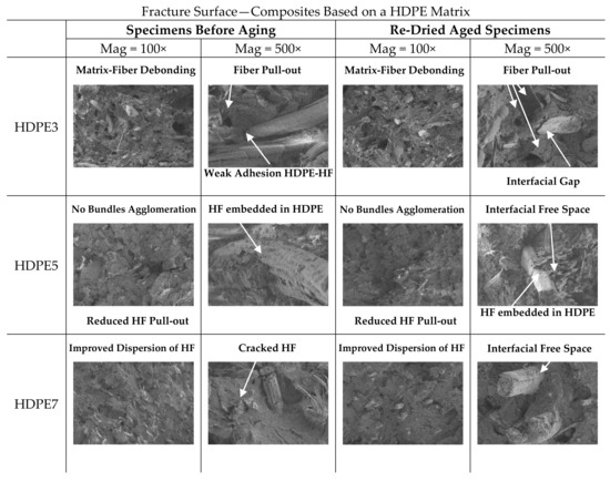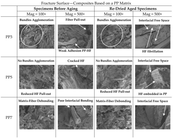 The effects of water absorption on the microstructure of re-dried aged specimens are also shown in Figure 12 and Figure 13. Generally, in re-dried aged specimens aged fibers are observed, surrounded by micro-cracks in the matrix (interfacial free space), where the loss of adhesion between fiber and matrix led to the deterioration of the flexural mechanical properties. Aged HF due to water absorption is confirmed by the presence of fibrillation, Figure 12 (PP3). Damage modes such as matrix-fiber interfacial debonding with holes left where fibres have been pulled out during flexural testing, are visible in the fractured surface. It can be assumed that fiber swelling in the transverse direction induces hoop stresses in the matrix, leading to plastic strain and micro-cracks. After drying, the shrinkage of fibres results in free space at the interface between matrix-fiber, which might contribute to fibre-matrix decohesion and hence weaken the interface and decreasing the flexural properties of the composites. This kind of damage has been observed also by other authors [14,18,21,58].
