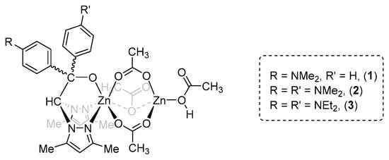 Dinuclear zinc complexes 1–3 (Figure 1) were synthesized in excellent yields as previously reported [53]. These complexes showed high stability in solution and in solid-state in the presence of air for months. As previously commented, these complexes displayed good catalytic activity for the synthesis of polycarbonates from the reaction of cyclohexene oxide with carbon dioxide and for the preparation of terpolymers [53].
