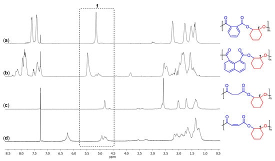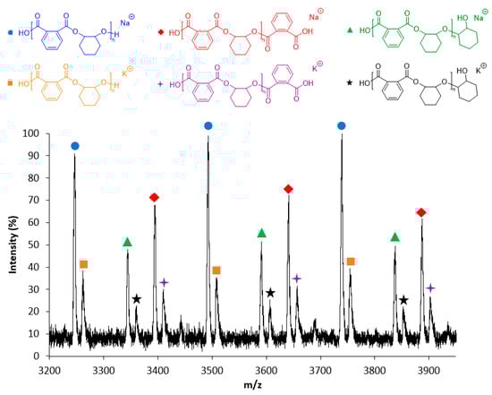 All polymers were characterized by NMR and IR spectroscopy (Figure 2 and Figures S1–S12 in the SI), gel permeation chromatography (GPC) (Figure S13 in the SI) and MALDI-ToF mass spectroscopy (Figure 3 and Figure S14 in the SI). The NMR spectra of copolymers 6,11–13 are in good agreement with those previously reported [32,36] and confirmed the formation of the corresponding alternating copolyester (Figure 2). On the other hand, the IR spectra of copolymers clearly showed the presence of a strong band in the range 1710–1729 cm−1 corresponding to the ν(C=O) stretching vibration of the ester group, which is shifted to lower wavenumbers compared with that of the corresponding cyclic anhydride starting materials (1736–1777 cm−1).