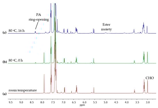 The reaction of one equivalent of 4 and 5 with one equivalent of complex 3 and 2 equivalents of PPNCl at 80 °C was also monitored by 1H NMR (Figure 6). It is worth noting that even at room temperature phthalic anhydride was activated by the catalytic system, and the chloride anion provided by PPNCl was able to ring-open the activated anhydride as it is supported by the appearance of new resonance signals at 8.3 ppm. When the reaction temperature was increased up to 80 °C, the signal at 8.30 ppm increased its intensity, ascertaining the fact that the first step of the copolymerization is the ring-opening of the cyclic anhydride. On the other hand, no changes in the signal of CHO were observed within 16 h. After that, most of the cyclic anhydride was ring-opened and a new signal at 4.98 ppm showed up which corresponds to the ester moiety (Figure 6).