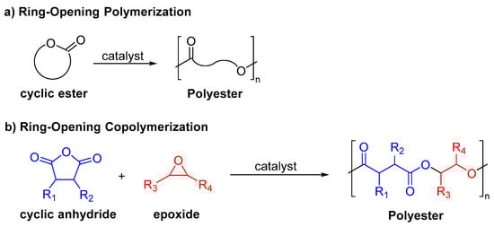 Synthesis of polyester materials via (a) ROP of cyclic esters; (b) ROCOP of epoxides and cyclic anhydrides.