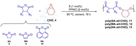 - Longo, J.M.; Sanford, M.J.; Coates, G.W. Ring-Opening Copolymerization of Epoxides and Cyclic Anhydrides with Discrete Metal Complexes: Structure-Property Relationships. Chem. Rev. 2016, 116, 15167–15197. [Google Scholar] [CrossRef]