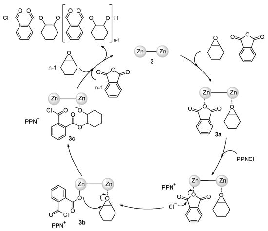 A plausible mechanism for the ROCOP of CHO and PA catalyzed by the catalytic system comprised by complex 3 and PPNCl is proposed in Scheme 4. Firstly, the epoxide and cyclic anhydride may coordinate to the two zinc centers to form intermediate 3a. Then, the chloride anion could attack at the activated cyclic anhydride to generate the metal carboxylate specie 3b which can therefore ring-open the activated molecule of CHO by the second zinc center to give rise to the alkoxide specie 3c, which could in turn experiment consecutive ring-opening reactions of cyclic anhydrides and epoxides to afford the corresponding polyester. Even though this proposal could be the main mechanism, an initiation step by an acetate group to result in polymers with an acetate end-group cannot be ruled out.
