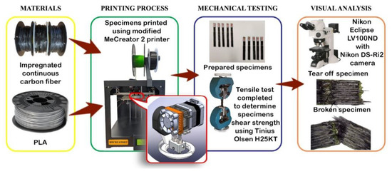 The research consists of three stages: the printing process, mechanical testing, and visual analysis. The research scheme is presented in Figure 1. Continuous carbon fibre and thermoplastic filament were used for printing the samples. Before the printing process, the continuous carbon fibre was specifically prepared in the solution of methylene chloride and PLA thermoplastic. The material extrusion-based FDM technology was used for printing all samples. Finally, tensile tests and visual analysis were performed in order to determine shear strength, maximum shear force, and failure mode. Failure mode was determined according to ASTM D 5573 (Standard practice for classifying failure modes in fiber–reinforced–plastic (FRP) joints) standard, while shear strength was assessed according to recommendations of ASTM D 3163 (Standard test method for determining strength of adhesively bonded rigid plastic lap–shear joints in shear by tension loading) standard.