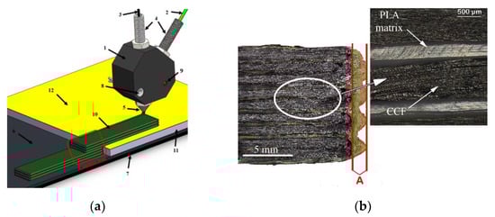 FDM technology printer MeCreator 2 (Geeetech, Shenzhen, China) was chosen to print the composite samples. The scheme of the printing process is shown in Figure 2a. It should be mentioned that the device initially was adapted to print single thermoplastic material only; thus, it needed a modification to print composite materials. Therefore, designed and manufactured a completely new heating element (1), and a modified cold zone of the print head was used during experiments. During the printing process, the thermoplastic (2) and the continuous carbon fibre tow (3) were inserted into the heating element simultaneously through two separate inlet channels (4). The matrix and the reinforcing material were mixed in the heating element just before the composite filament was extruded through the printing nozzle (5) onto a boron silicate glass plate (6) which was placed on a metal printing platform (7). It should be noted that matrix material (PLA) was fed to the print head using a standard filament feeding system.