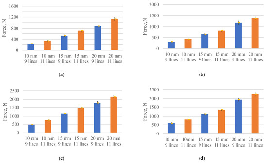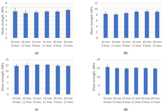 During the experiment, all samples were successfully separated. None of the samples was broken above or below the shear area. This means that the average tensile strength of the test structure was not exceeded during the test; the average tensile strength of the composite material was determined experimentally and accounted for approximately 204 MPa. The test resulted in finding out the force necessary for the separation of the specimen. Detailed results are presented in Figure 4, having them grouped according to the printing line width and the layer height. Results of the samples with 9 lines per width are presented in blue colour, while results of samples with 11 lines are presented in orange colour. As can be seen from the diagrams in Figure 4, the main factors having an influence on the value of the shear force are the overlap length and number of lines. Obviously, these two parameters also directly affect the shear area. Assessing how the results change when the sample layer height decreases from 0.4 mm to 0.3 mm, it can be seen that the amount of force required for separation increases significantly. The average shear force is 235.6 N for samples printed using 1.2 mm–0.4 mm (line width-printing layer height) parameters, nine printing lines, and nominal overlap length of 10 mm (Figure 4a); however, when the layer height changes to 0.3 mm, the shear force increases to 470.33 N (Figure 4c). The change of the layer height from 0.4 mm to 0.3 mm allows increasing the shear force about two times. A similar upward tendency is observed in the sample groups printed with the different layer heights and with a constant line width of 1 mm. For example, the shear force increases from 314 N to 593.3 N or 88 percent for samples with nine lines and 10 mm overlap length when the layer height changes from 0.4 to 0.3 mm. This upward tendency does not depend on the shear area, the number of printing lines, or the overlap length, and remains approximately the same in all sample groups, as seen in Figure 4.