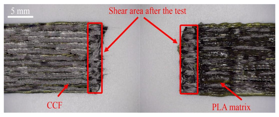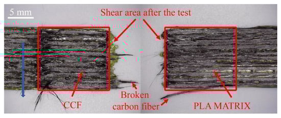 This suggests the presumption that the sample is affected only by shear forces during the test. However, assessing the interlayer adhesion, it can be seen that lines of plastic and impregnated carbon fibre are visible on the surface of the layers. Obviously, better mutual adhesion can be achieved due to a higher amount of matrix material in the shear area, a lower layer height, or a printing line width. Using lower printing parameters, i.e., at a lower layer height and line width, the structural integrity of the structure is better because the carbon fibre is embedded more firmly in the thermoplastic matrix during the manufacturing process. Accordingly, Figure 7 shows the picture of the sample with a small shear area. Although no visual damage is visible, the small overlap length is reduced even more due to the displacement effect mentioned above, and it does not allow achieving better adhesion results.