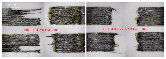 However, some specimens with an overlap length of 20 mm have a tendency to separate with different failure modes. Therefore, it was decided to analyse failure modes of samples after the shear test according to the ASTM D 5573 standard. The results indicate that most of the samples show light-fibre-tear failure modes. Examples of these failure modes are presented in Figure 8. Fibre-tear failure occurs exclusively within the fibre-reinforced polymer matrix, and it is characterised by the appearance of reinforcing fibres on both separated surfaces. Light-fibre-tear failure occurs within the fibre-reinforced polymer substrate near the surface and is characterised by a thin layer of the FRP resin matrix visible on one side of the specimen, with few or no carbon fibres transferred from one part to another. However, after analysis, a clear tendency is not observed, i.e., in several groups of samples two different failure modes are found. These groups of samples were produced with different printing parameters when the overlap length was 20 mm. In such groups of samples, light-fibre-tear and fibre-tear failure modes are observed. Despite the fact that clear tendency is not identified, it should be mentioned that most of the samples printed with 0.3 mm layer height and 1 mm line width show fibre-tear failure modes. This behaviour can be explained by improved adhesion between layers which is observed during shear force analysis.
