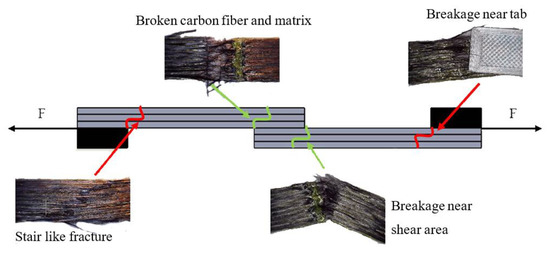 Samples with an overlap length above 20 mm were not included in the research because they tended to break before they could be separated during the test. In this case, two different types of breakages are observed: breakage at one of the tabs and breakage at the ends of the shear area, which can be seen in Figure 9. If the breakage at the tabs can be explained by the resulting stresses in the compression zone, then the breakage at the contact zone clearly indicates that the tensile strength of the sample is exceeded.