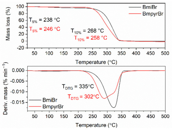 Thermogravimetric (TG) and derivative thermogravimetric (DTG) curves of BmiBr and BmpyrBr.