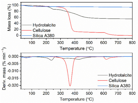 The thermal decomposition of synthetic hydrotalcite (HTA), which is a magnesium aluminum hydroxycarbonate (Mg6Al2(CO3)(OH)16·4H2O), was a two-step process. The first mass loss was approximately 14% and occurred at a temperature below 250 °C with a TDTG of 240 °C. It resulted from the desorption of water that was physically adsorbed by the HTA, accompanied by the dehydration (removal of water from hydrates). In the second stage, the dehydroxylation occurred together with decarbonation, i.e., removal of CO2 [78], in the temperature range of 250–800 °C, with a TDTG of approximately 445 °C and a mass loss of 31.3%. The total mass loss resulting from HTA thermal decomposition was 45.2%.