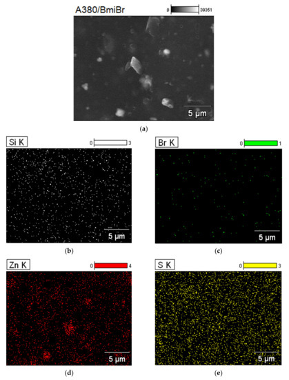 Scanning electron microscopy (SEM) image and Energy-dispersive X-ray spectroscopy (EDS) maps for A380-filled vulcanizate containing BmiBr: (a) SEM image; (b) EDS map for Si; (c) EDS map for Br; (d) EDS map for S; (e) EDS map for Zn.
