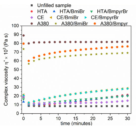 Effect of fillers and ILs on the complex dynamic viscosity (η*) of NR compounds as function of time.