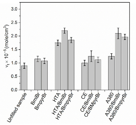 Regardless of the filler type, ILs increased the crosslink density of NR vulcanizates. Furthermore, vulcanizates with BmiBr exhibited slightly higher crosslink densities than those containing BmpyrBr. The beneficial influence of ILs on the crosslink density was especially evident for the vulcanizates filled with silica A380, which shows a strong ability to adsorb the crosslinking system. As mentioned previously, ILs similar to silane coupling agents can adsorb on the silica surface, as postulated in the literature [81], reducing its ability to adsorb curatives, and consequently increasing the efficiency of vulcanization.