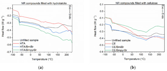 Differential scanning calorimetry (DSC) curves of NR compounds filled with: (a) HTA; (b) CE; (c) A380.