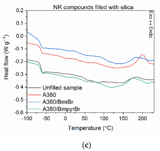Differential scanning calorimeter DSC1 (Mettler Toledo, Greifensee, Switzerland) was used to study the effect of fillers and ILs on the temperature and enthalpy of NR crosslinking. Using a STARe software, the onset temperature of the peak corresponding the crosslinking reactions was determined, following the procedure given in the ISO 11357-1 [61] standard. The measurements were carried out for small pieces of rubber compounds, with a mass of approximately 10 mg, which were heated from −150 °C to 250 °C, with a heating rate of 10 °C/min. Liquid nitrogen was applied for sample-cooling, and the protective gas used during measurements was nitrogen, with the flow rate of 80 mL/min.