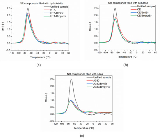 The loss factor is a measure of the material’s ability to dampen vibrations. Analyzing the DMA curves presented in Figure 7a–c, only one phase transition, i.e., the glass transition of NR elastomer, was observed in the tan δ curves of all vulcanizates in the measured temperature range. This transition is accompanied by a peak in the tan δ versus temperature curve, the maximum of which corresponds to the Tg of elastomer. Owing to the highest flexibility, the unfilled vulcanizate exhibited the highest mechanical loss factor at Tg (tan δTg of approximately 2.5). The addition of fillers decreased the height of the tan δ peak due to the reduction in the chains’ mobility compared to the unfilled elastomer matrix [87]. As was concluded previously, based on the results of tensile properties, the applied fillers enhanced the stiffness and consequently reduced the flexibility of the NR vulcanizates and, therefore, the values of tan δ at Tg. HTA had the least influence on the elastomer chains mobility and stiffness of NR vulcanizates, hence the values of tan δ at Tg decreased slightly as compared to the unfilled sample and were in the range of 2.0–2.2 (Figure 7a). CE had a greater impact on the mobility of elastomer matrix chains and stiffness of NR vulcanizates than HTA and, thus, the values of tan δTg decreased by almost 30% in comparison with the unfilled sample (Figure 7b). As previously mentioned, silica A380 strongly stiffened the NR elastomer and significantly reduced the height of the tan δ peak. This revealed that the network formed by the silica particles severely limited the mobility of the chains in the elastomer matrix [86]. As a consequence, vulcanizates filled with silica demonstrated the tan δ at Tg of 1.0, and therefore were approximately 60% smaller compared to the unfilled vulcanizate (Figure 7c). Regardless of the filler used, ILs did not significantly affect the values of tan δ in the measured temperature range; therefore, ILs had no influence on the damping properties of the NR vulcanizates. Regarding the viscoelastic properties of the vulcanizates in the rubbery elastic region, HTA and CE did not alter the tan δ in the temperature range of 25–60 °C compared to the unfilled sample. The differences in tan δ values were within the range of measurement error and the DMA curves in this region almost overlapped. On the other hand, the A380-filled vulcanizates showed tan δ values more than twice as high as those of the unfilled vulcanizate in the rubbery elastic region. However, it resulted from the much higher stiffness of these vulcanizates and should not be interpreted as an improvement in the ability of the material to dampen vibrations compared to other vulcanizates.