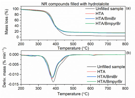 Analyzing the thermal decomposition of NR vulcanizates, the first mass loss determined in argon at 25–600 °C corresponds to the pyrolysis of rubber and thermal decomposition of the organic ingredients present in the vulcanizate, i.e., MBT accelerator, ILs and CE. In the case of HTA-filled vulcanizates, the first mass loss is also related to the decomposition of HTA, as confirmed by the TG results of the pure filler. The highest mass loss in the temperature range of 25–600 °C was achieved for the unfilled sample and for the vulcanizates containing CE. It should be noted that CE is an organic filler, which underwent significant thermal decomposition in this temperature range (Figure 2). The lowest mass loss in in the temperature range of 25–600 °C was observed for the vulcanizates filled with silica A380, since this filler is the most thermally stable of the tested fillers and only loses adsorbed water. The second mass loss occurred in air atmosphere at 600–800 °C. In this stage, the carbon residue after the pyrolysis of elastomer and organic additives was burnt, so this mass loss was the highest for the vulcanizates containing CE and ILs. As expected, all vulcanizates with ILs were characterized by a higher mass loss in this temperature range. The residue after thermal decomposition at 800 °C consisted of ash and mineral compounds; therefore, it was the highest for the vulcanizates filled with silica and HTA. For the A380-filled vulcanizates, the residue at 800 °C consisted of the filler and vulcanization activator, i.e., ZnO. For the unfilled sample and vulcanizates with CE, only ZnO remained after thermal decomposition, whereas, in the case of HTA-filled vulcanizates, it was ZnO, and some mineral residue containing mixed oxides of magnesium and aluminum. Most importantly, regardless of the filler used, the NR vulcanizates were thermally stable up to a temperature of approximately 300 °C.