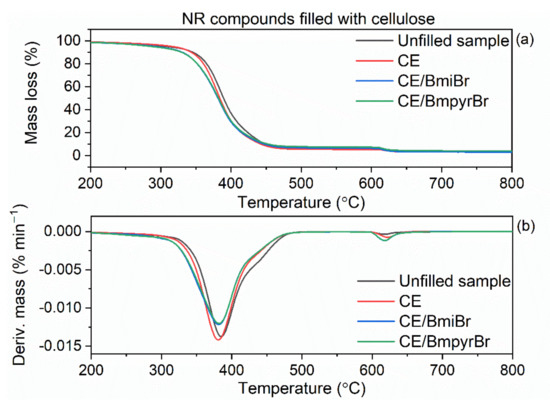 Regardless of the filler used, ILs deteriorated the thermal stability of NR vulcanizates, especially those filled with CE (T5% reduced by 23 °C and 29 °C for BmiBr and BmpyrBr, respectively). The least influence of ILs on T5% was observed for the vulcanizates filled with silica A380. BmiBr reduced T5% by 12 °C, whereas BmpyrBr was reduced by 15 °C, compared with the vulcanizate without ILs. Generally, vulcanizates containing BmiBr exhibited higher T5% than that of the BmpyrBr-containing sample. This resulted from the higher thermal stability of BmiBr in comparison with BmpyrBr.