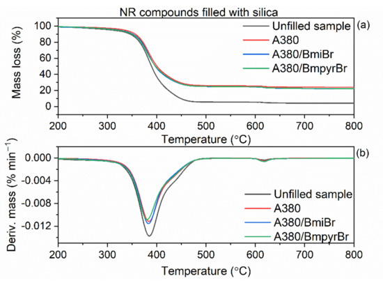 NR vulcanizates filled with silica A380: (a) TG curves; (b) DTG curves.