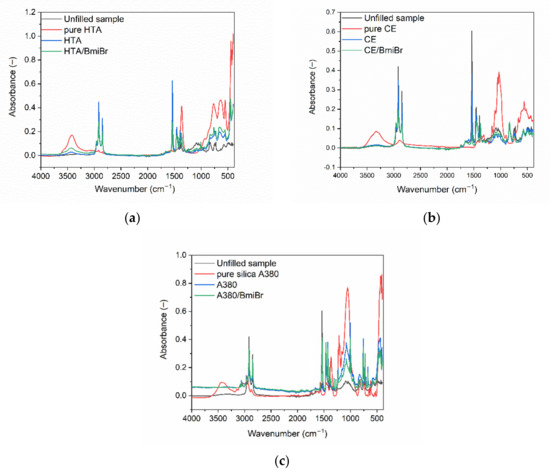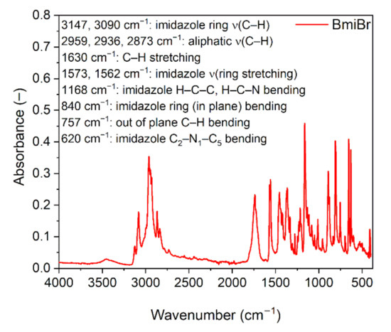 FTIR spectroscopy was employed to investigate the possible interactions between NR, fillers and ILs. Measurements were carried out for pure fillers and ILs, as well as for NR vulcanizates. All the reported peak values were based on the maximum peak height of the unfitted spectra. Regarding the effect of ILs, the results for BmiBr were presented as an example, since no significant differences between the FT-IR spectrum of BmpyrBr and BmiBr were observed The FT-IR spectrum of BmiBr is presented in Figure 11, and is consistent with the FT-IR spectrum reported for this ionic liquid by other researchers [91,92]. The FT-IR spectra collected for NR vulcanizates are shown in Figure 12.