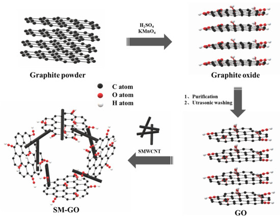 GO was prepared by the improved Hummers method. First, 2 g graphite powder and 1 g NaNO3 were added to 80 mL H2SO4 solution. The mixture was placed in an ice bath with a temperature below 15 °C and was stirred continuously for two hours. A total of 12 g of KMnO4 was gradually added during the stirring process. Thereafter, the temperature of the mixture was raised to 35 °C, and the mixture was stirred for another 30 min. Second, the mixture was diluted with 160 mL deionized water and stirred in a room temperature water bath for 15 min. Third, 500 mL deionized water (75 °C) and 30 mL H2O2 were added to the mixed solution and stirred in a constant-temperature water bath at 75 °C for 4 h. Finally, the mixed solution was pickled and washed until the pH value of the solution was neutral. GO solution was obtained by ultrasonic and centrifugal treatment, and brown GO powder was obtained after freeze-drying for 48 h. SM-GO was synthesized by non-covalent interaction between GO and SMWCNTs. SMWCNTs and GO powders of the same mass were added to deionized water and sonicated for 12 h to prepare a brown solution. SM-GO powder was obtained after freeze-drying for 48 h. The above preparation process is shown in Figure 1.