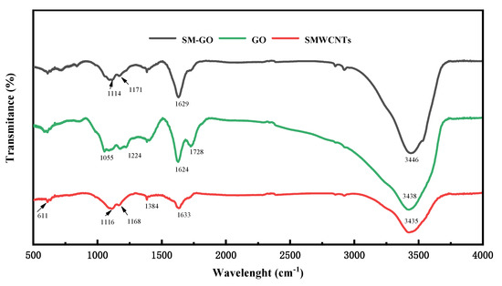 The specific functional groups of the samples were observed from the FT-IR spectrum, reflecting the chemical structure characteristics, as shown in Figure 2. Besides the absorption peaks caused by the unoxidized domain and aromatic ring structure at 1627 cm−1 and 611.4 cm−1, the GO samples also have absorption peaks at 1055 cm−1, 3438 cm−1, 1224 cm−1, and 1728 cm−1, corresponding to the stretching vibrations of the C–O–C bond, O–H bond, C–O bond, and C=O bond, respectively. It shows that there are oxygen-containing groups of the epoxy group, hydroxyl group, and carboxyl group in the sample, which proves that GO is successfully synthesized in this experiment. SMWCNTs also have diffraction peaks caused by the unoxidized domain and aromatic ring structure at 1633 cm−1 and 611 cm−1. In addition, there are absorption peaks caused by the of the C–O bond and O–H bond at 1384 cm−1 and 3435 cm−1, and absorption peaks caused by the sulfonic group at 1116 cm−1 and 1168 cm−1, which proves that MWCNTs are successfully sulfonated. For the SM-GO samples, the absorption peak positions are roughly the same as that of GO. The difference is that the absorption peak at 1114 cm−1 becomes a single peak, and the position shifts, which is consistent with that of the sulfonic acid group, proving that the SM-GO is successfully prepared.