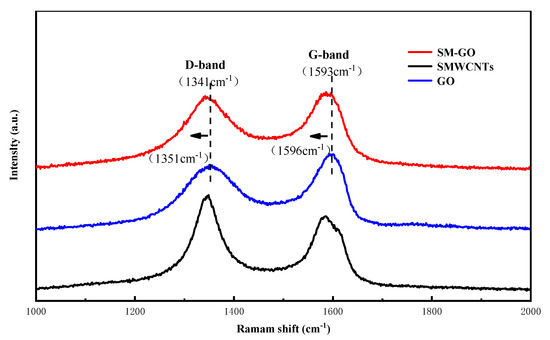 As shown in Figure 4, two leading bands exist in the Raman spectrum. The D- and G-band are related to the breathing mode of A1g symmetry and E2g symmetry of sp2 carbon atoms, respectively [3]. After the modification of GO by SMWCNTs, the characteristic peak of the D- (1351 cm−1) and G-band (1596 cm−1) move to 1341 cm−1 and 1593 cm−1, respectively, which show that there is charge transfer between SMWCNTs and GO. The strength ratio of the D- to G-band (ID/IG) represents the quality of graphitization or defects in the structure of carbon materials. Due to the increase in the number of isolated sp2 domains, the D-band of SM-GO increases, resulting in an increase in ID/IG from 0.85 to 0.95 [28], which proves that GO is successfully modified by SMWCNTs.