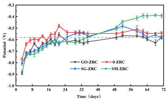 Figure 5 shows the variation of OCP values of different coating samples immersed in 3.5 wt.% NaCl solution. The OCP values can reflect the protection characteristics of different coatings [29,30]. When the OCP is lower than the minimum potential value −1.143 V (vs. SCE), the hydrogen evolution occurs. When the OCP is higher than the maximum potential value −0.58 V (vs. SCE), the cathodic protection effect of the coating is invalid [9,31]. In the initial stage of immersion, the OCP values of all samples are less than −0.58 V, indicating that all four coatings have effective cathodic protection. With the increase in soaking time, the OCP value of 0-ZRC samples increases rapidly. The electrolyte solution permeates into the coating matrix through the micropores on the coating surface, which causes the rapid consumption of zinc particles and produces a large number of corrosion products such as ZnO and Zn(OH)2. As a result, the electron flow channel between zinc particles is cut off, and the cathodic protection ability of the coating is reduced. After immersion for 16 days, the OCP value of the 0-ZRC sample is higher than that of carbon steel, which indicates that the coating has lost the ability of cathodic protection and entered the shielding stage.