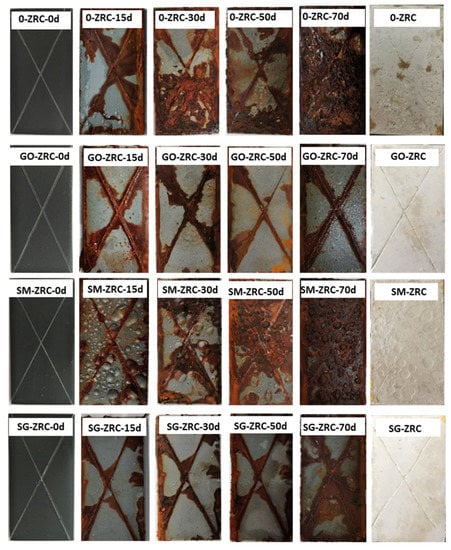The surface morphology of different coatings after 0, 15, 30, 50, and 70 d exposure to salt spray are shown in Figure 9. After the salt spray test, the surface morphology of the four coatings changes significantly. After 30 days, a large number of corrosion products accumulated on the surface of 0-ZRC. However, only a small amount of corrosion products formed on the surface of GO-ZRC, SM-ZRC, and SG-ZRC samples. This is because the conductive nanoparticles connect a large number of zinc particles into a huge conductive network, and the zinc particles in the entire conductive network are uniformly corroded.