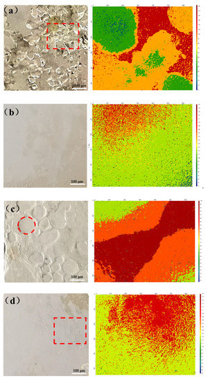 The surface of the metal substrate of the GO-ZRC sample was smooth, and no corrosion pits were observed, as shown in Figure 7b. It is confirmed that GO-ZRC provides sufficient protection for metal substrates. Regular circular etching pits could be observed on the metal substrate surface of SM-ZRC samples, which is related to the galvanic corrosion, as shown in Figure 7c. An evident ladder-like 3D morphology could be observed at the connection of two adjacent corrosion pits. Additionally, the maximum height difference of the metal surface was 54.43 μm. It indicates that SM-ZRC cannot provide enough protection for the metal substrate. Tiny etching pits (square marked) were observed on the metal substrate surface of the SG-ZRC sample, as shown in Figure 7d. The maximum height difference was 16.09 μm, which proves that the metal substrate of the SG-ZRC sample was partially corroded.