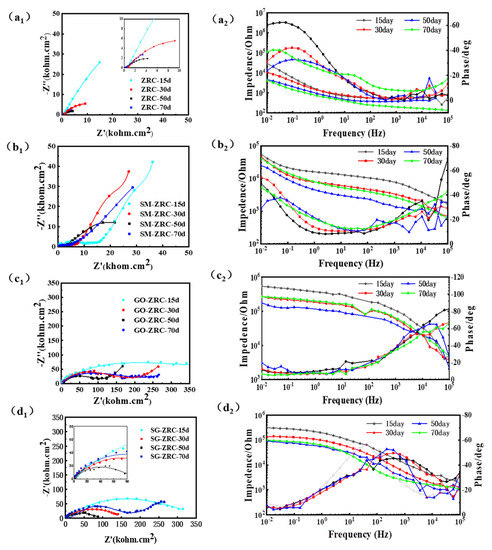 Nyquist and Bode diagrams of the (a1,a2) 0−ZRC, (b1,b2) SM− ZRC, (c1,c2) GO−ZRC and (d1,d2) SG−ZRC samples after 15, 30,50 and 70 days immersion in 3.5 wt.% NaCl solution.