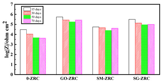 The impedance modulus |Z| of the lowest frequency (0.01 HZ) in the Bode diagram can be used as an indicator of the impermeability of the coating. The impedance modulus of all samples decreases with the immersion time, which is due to the gradual infiltration of the electrolyte solution into the coating, as shown in Figure 12. After being immersed in the electrolyte solution for 15 days, the impedance modulus of the 0-ZRC sample was 3.0 × 104 Ω·cm2, while it is decreased to 1.1 × 104 Ω·cm2 and 4.2 × 103 Ω·cm2 after soaking for 30 days and 70 days, respectively. The impedance modulus of the samples with nanoparticles is higher than that of 0-ZRC samples, which is due to the barrier properties of the nanoparticles. The impedance modulus of the GO-ZRC sample was 5.5 × 105 Ω·cm2, after soaking for 15 days. With the permeation of the electrolyte solution, the impedance modulus decreased to 1.8 × 105 Ω·cm2 (soaking for 50 days). Subsequently, the corrosion products form dense protection film on the surface of the metal substrate. The barrier property of the coating is enhanced, and the impedance modulus increased to 2.7 × 105 Ω·cm2. After being immersed in the electrolyte solution for 15 days, the impedance modulus of the SM-ZRC sample was 5.5 × 104 Ω·cm2, while it is decreased to 2.5 × 104 Ω·cm2 after soaking for 50 days. Similar to the case of the GO-ZRC, the impedance modulus of the SM-ZRC increased to 4.1 × 104 Ω·cm2 (soaking for 70 days). After soaking for 15 days, the impedance modulus of the SG-ZRC sample was 3.2 × 105 Ω·cm2. With the permeation of the electrolyte solution, the impedance modulus decreased to 1.3 × 105 Ω·cm2 after soaking for 30 days. After soaking for 70 days, the impedance modulus of the sample decreased to 9.9 × 104 Ω·cm2. During the whole immersion process, the impedance modulus of SM-ZRC and SG-ZRC was lower than that of GO-ZRC. This is due to the galvanic corrosion of SM-ZRC and SG-ZRC. The corrosion products destroy the adhesion of the coating to the metal substrate and accelerate the penetration of corrosive substances. Although galvanic corrosion also exists in the SM-GO coating, the barrier performance of SM-GO in the coating is better than that of the SMWCNTs. Therefore, the corrosion resistance of the SG-ZRC sample is greater than that of SM-ZRC. In addition, none of the four coatings swelled or peeled off during the immersion test for 70 days, and the impedance spectrum test results also show that the coating did not enter the failure period, indicating that the coating still protects the substrate metal [6,40,41,42].