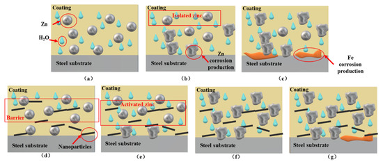 Pure zinc-rich coating (a) cathodic protection stage; (b) shielding stage; (c) failure stage; zinc-rich coating containing nanoparticles (d) initial shielding stage; (e) cathodic protection stage; (f) shielding stage; (g) failure stage.