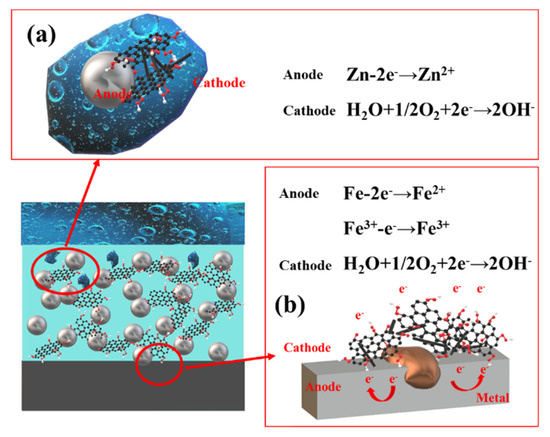 Galvanic corrosion of (a) SM−GO and zinc particles; (b) SM−GO and metal substrate.