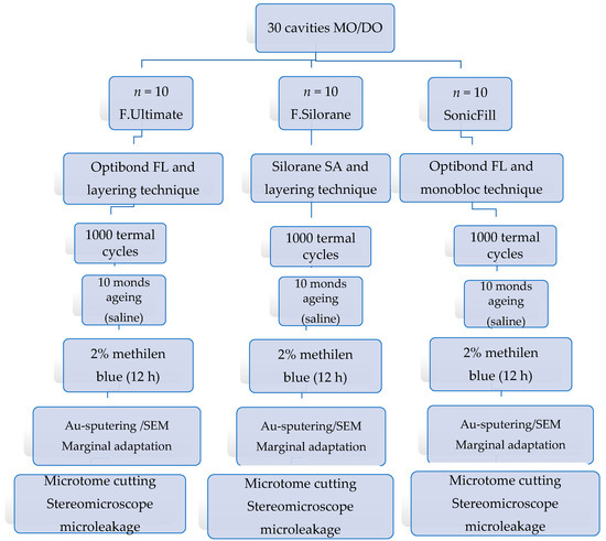 - Dos Santos, P.J.; Silva, M.S.; Alonso, R.C.B.; Alpino, D. PHP Hydrolytic degradation of silorane- and methacrylate-based composite restorations: Evaluation of push-out strength and marginal adaptation. Acta Odontol. Scand. 2013, 71, 1273–1279. [Google Scholar] [CrossRef]